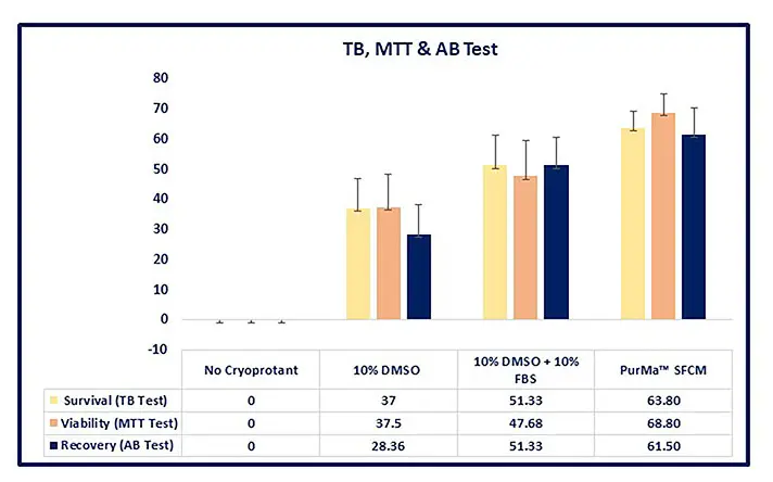 - PurMaTM SFCM results in the lowest cell loss during freezing and thawing as well as the highest cell recovery. Moreover, it provides over 66% survival and recovery rate after long term cryopreservation.